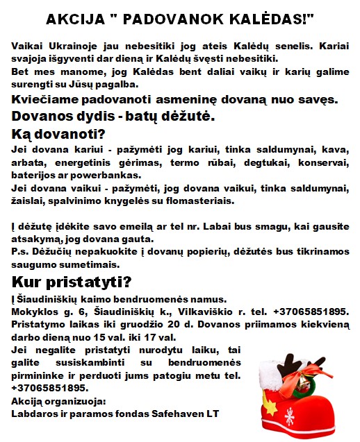 Kviečiame prisijungti prie akcijos „Padovanok Kalėdas“. Ši akcija skirta Ukrainos vaikams ir kareiviams.