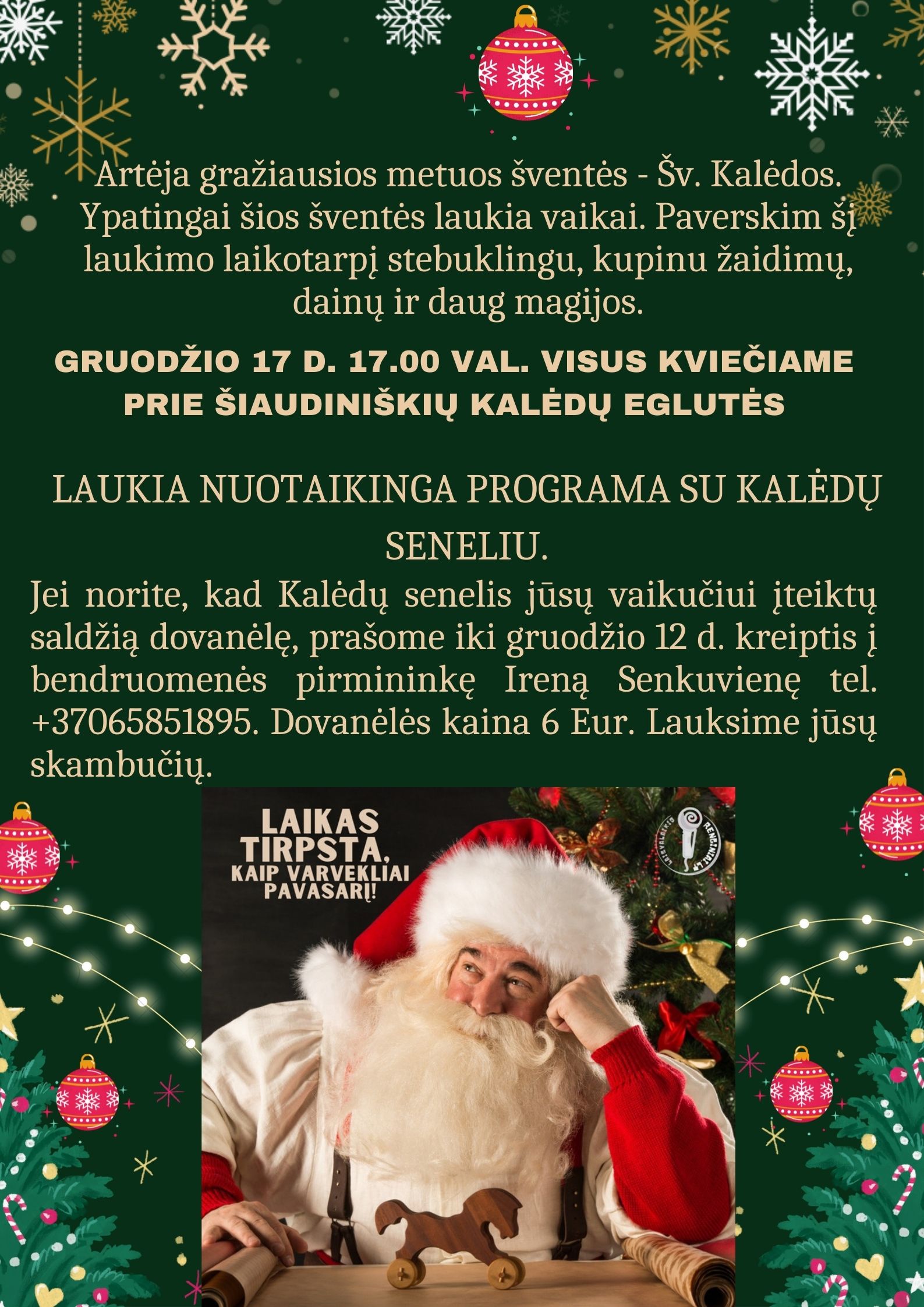 Gruodžio 17 d. 17.00 val. kviečiame susitikti prie Šiaudiniškių Kalėdų eglutės, kur jūsų lauks Kalėdų senelis su nuotaikinga programa.