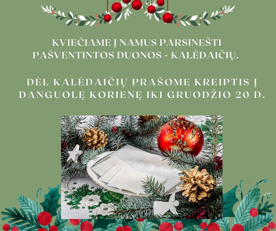 Kaip ir kasmet, artėjant Šv. Kūčių vakarui, kviečiame į namus parsinešti kalėdaičių. Kreiptis į Danguolę Korienę.