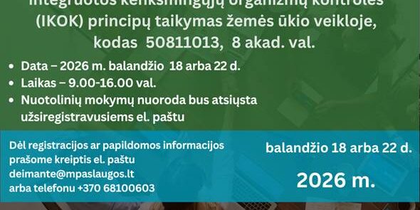 Seminaro tema „Tausus augalų apsaugos produktų naudojimas bei integruotos kenksmingųjų organizmų kontrolės (IKOK) principų taikymas žemės ūkio veikloje”.