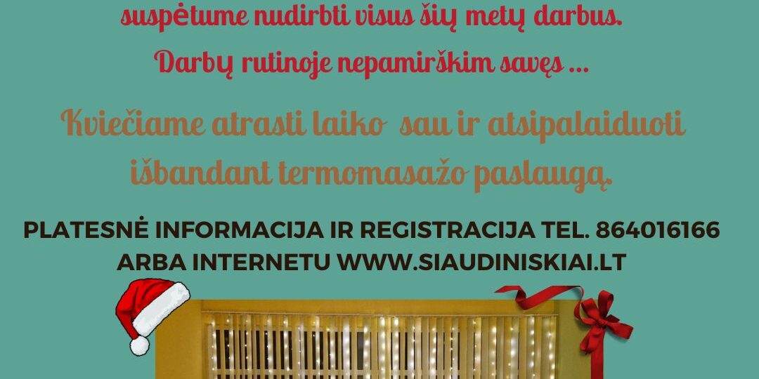 Šiaudiniškių kaimo bendruomenėje galite išbandyti termomasažo paslaugą. Būtina registracija internetu www.siaudiniskiai.lt arba telefonu nurodytu skelbime.